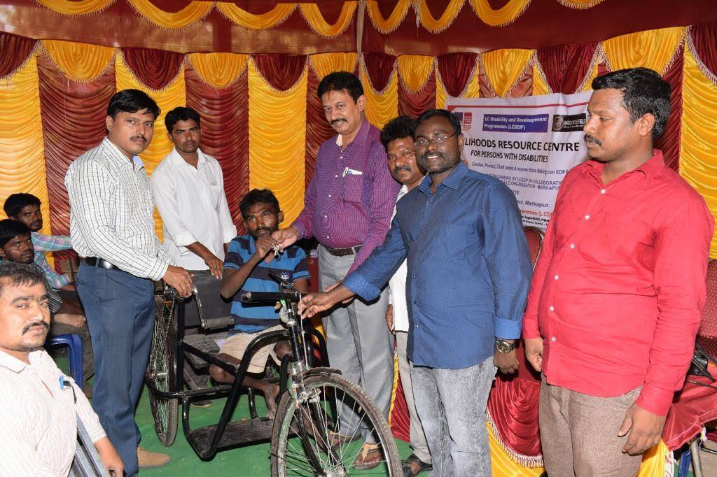 With collaboration of LCDDP we given Skill development training for person with disables for their sustainable development. Mandal Parshath Development Officer, Area Project Officer MGNREGS, Sub-inspector of Police and Area Coordinator of IKP project Inaugurated. We trained more than 60 people how to make Candles, Phenol, Chalk pices & Incense Sticks in Markapur. And also we provided seed support for their self employment. We have 7 Person with Disables Groups. We also provided try cycles for physically challenged person and also supported for start unit what they learn.